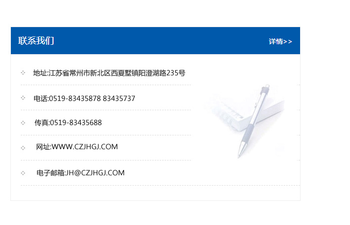 傳真:0519-83435688    郵編:213135    網址:WWW.czjhgj_com.jiangxikangtaitang.com    電子郵箱:JH@czjhgj_com.jiangxikangtaitang.com
